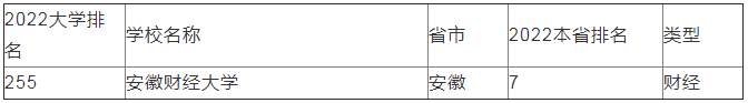 安徽財經大學2022年在全國本科院校排名第255位,本省大學排名第7位。