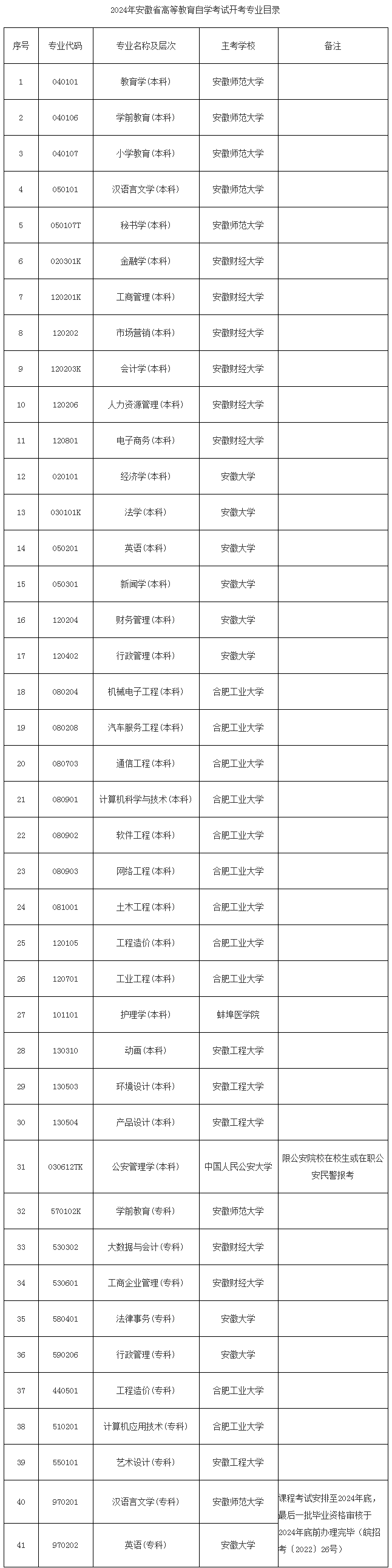 2024年安徽省高等教育自學考試共開考專業41個,其中本科專業31個,??茖I10個。廣告學等7個本科專業、公共安全管理等11個??茖I,自2024年起不再安排課程考試。漢語言文學等2個??茖I處于??歼^渡期,已不再接納新考生報名,課程考試安排至2024年底,最后一批畢業資格審核于2024年底前辦理完畢。在規定時間內未能畢業的??紝I考生,可改報其它自學考試專業,課程代碼及課程名稱相同的課程可繼續使用。